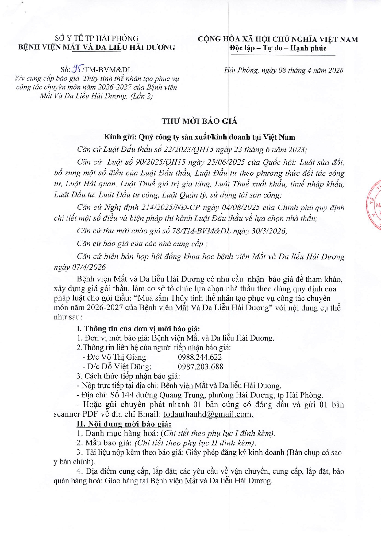 THƯ MỜI BÁO GIÁ THUỶ TINH THỂ NHÂN TẠO PHỤC VỤ CÔNG TÁC CHUYÊN MÔN NĂM 2026 - 2027 CỦA BỆNH VIỆN MẮT VÀ DA LIỄU HẢI DƯƠNG