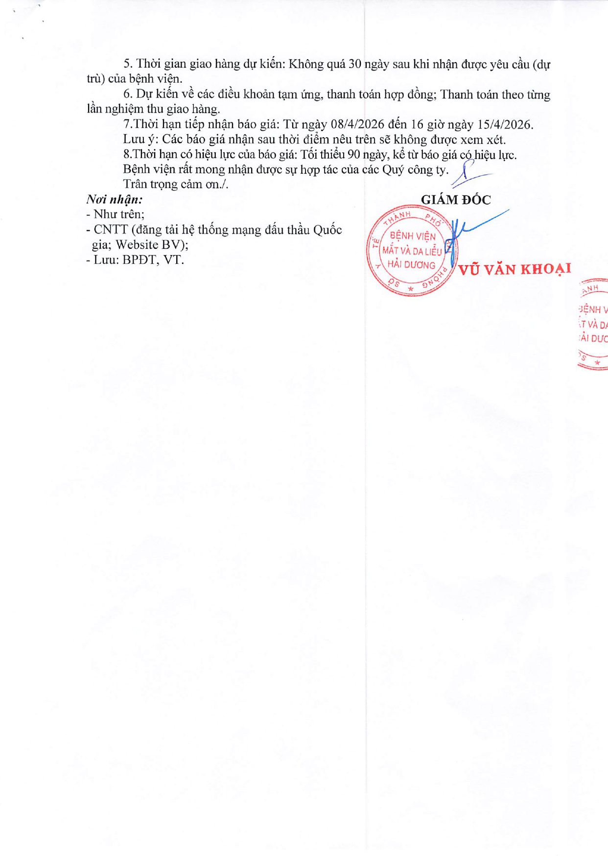 Cập nhật lúc: 15:05 - 08/04/2026 THƯ MỜI BÁO GIÁ CUNG CẤP BÁO GIÁ THUỶ TINH THỂ NHÂN TẠO PHỤC VỤ CÔNG TÁC CHUYÊN MÔN NĂM 2026 - 2027 CỦA BỆNH VIỆN MẮT VÀ DA LIỄU HẢI DƯƠNG (LẦN 2) | Giới thiệu THU MOI BAO GIA THUỶ TINH THỂ LẦN 2.pdf