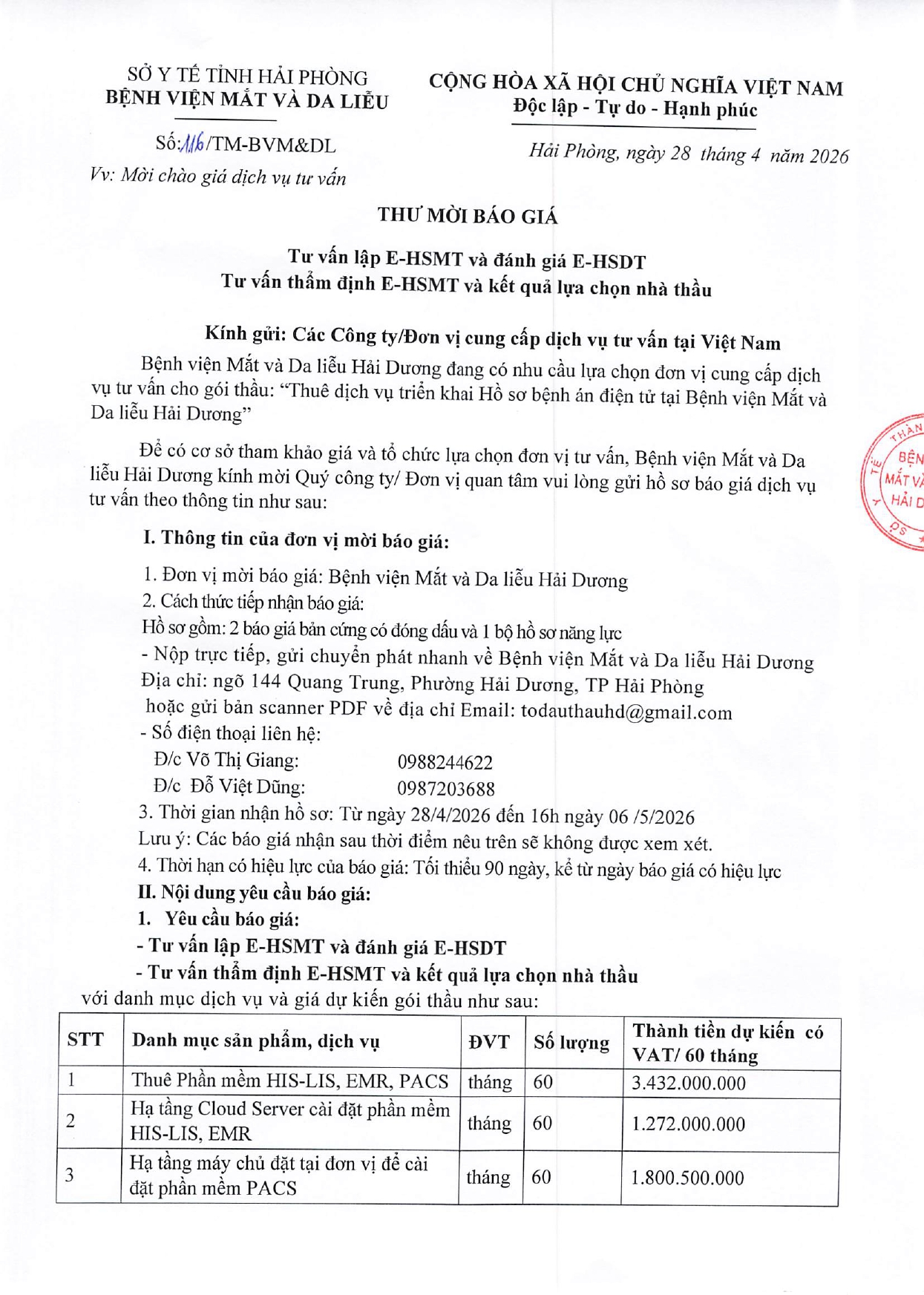THƯ MỜI BÁO GIÁ CHI PHÍ THUÊ DỊCH VỤ TRIỂN KHAI HỒ SƠ BỆNH ÁN ĐIỆN TỬ TẠI BỆNH VIỆN MẮT VÀ DA LIỄU HẢI DƯƠNG