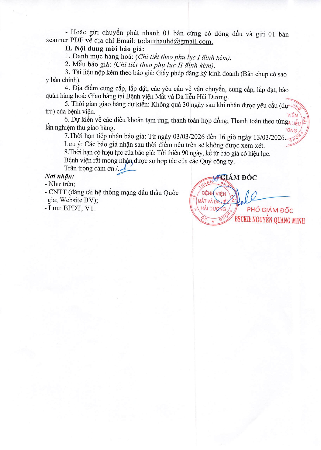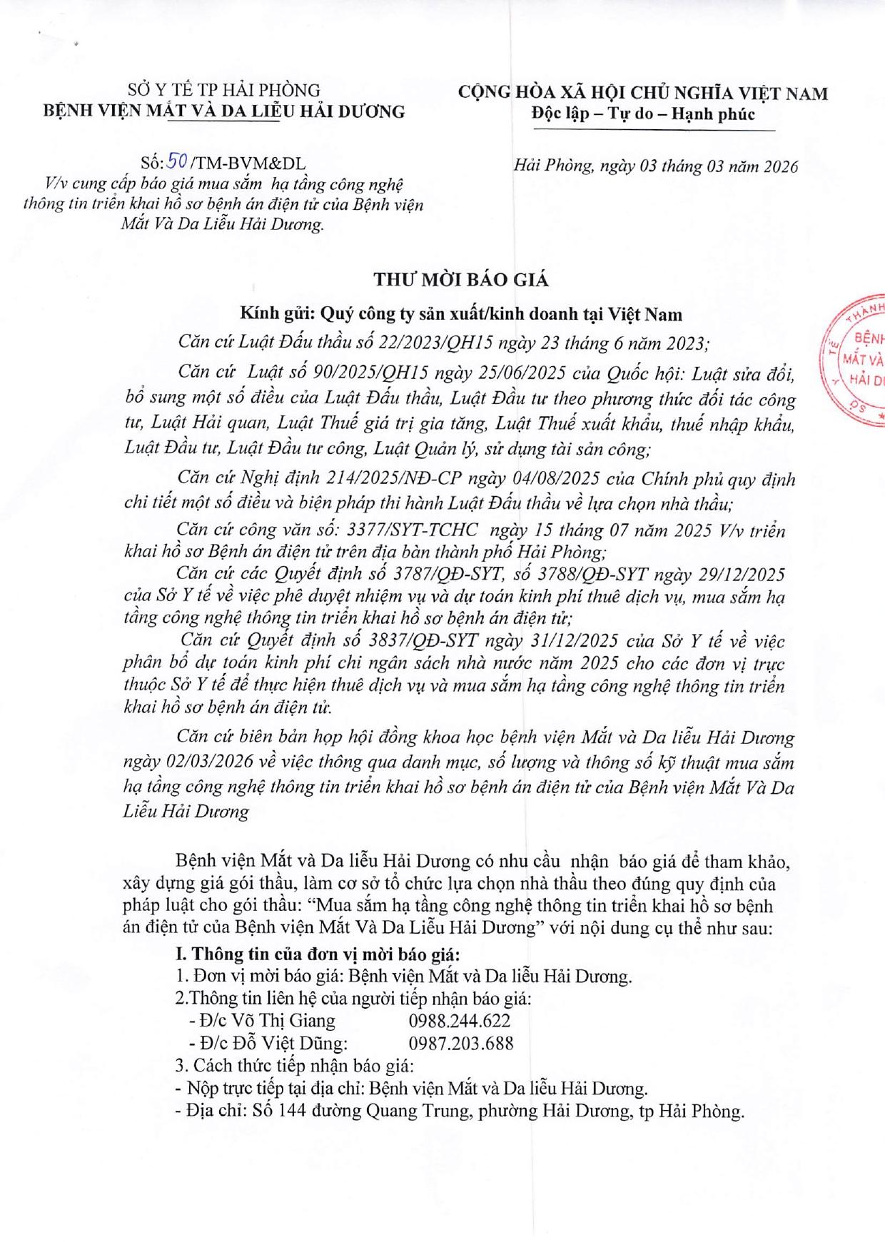 THƯ MỜI BÁO GIÁ MUA SẮM HẠ TẦNG CÔNG NGHỆ THÔNG TIN TRIỂN KHAI HỒ SƠ BỆNH ÁN ĐIỆN TỬ CỦA BỆNH VIỆN MẮT VÀ DA LIỄU HẢI DƯƠNG