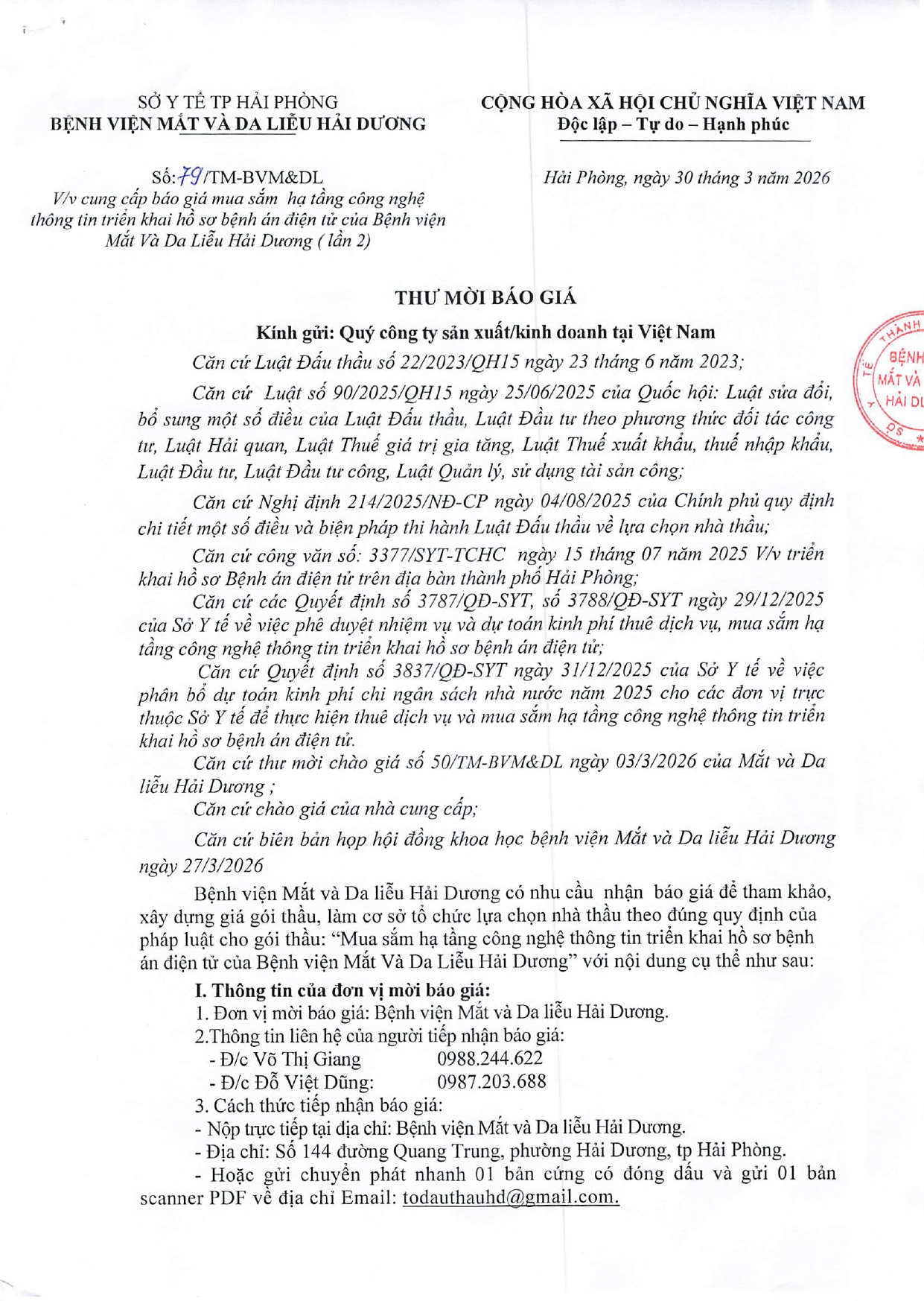 THƯ MỜI BÁO GIÁ MUA SẮM HẠ TẦNG CÔNG NGHỆ THÔNG TIN TRIỂN KHAI HỒ SƠ BỆNH ÁN ĐIỆN TỬ CỦA BỆNH VIỆN MẮT VÀ DA LIỄU HẢI DƯƠNG benhvienmatvadalieu 30/03/2026 Đọc thêm