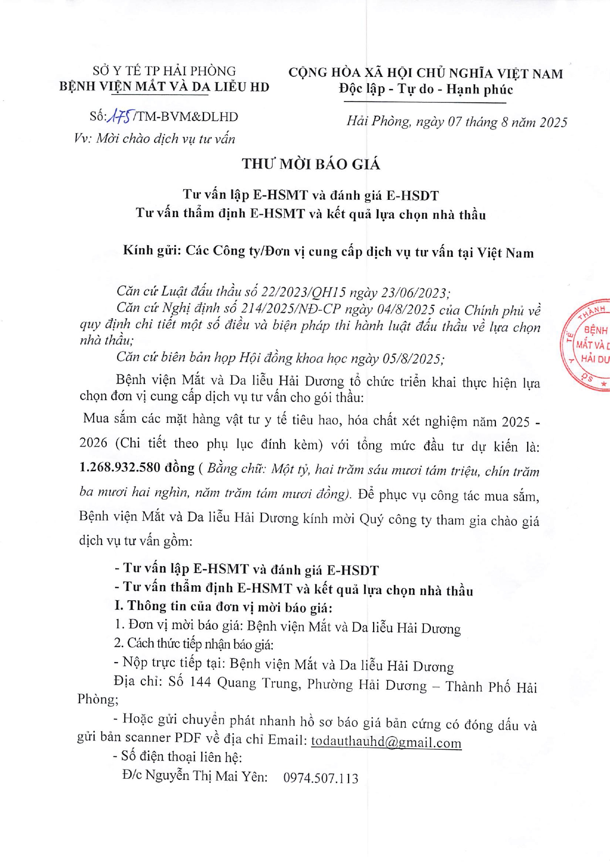 THƯ MỜI THẨM ĐỊNH GIÁ CÁC MẶT HÀNG THIẾT BỊ Y TẾ PHỤC VỤ CÔNG TÁC CHUYÊN MÔN NĂM 2025 benhvienmatvadalieu 09/10/2025 Đọc thêm