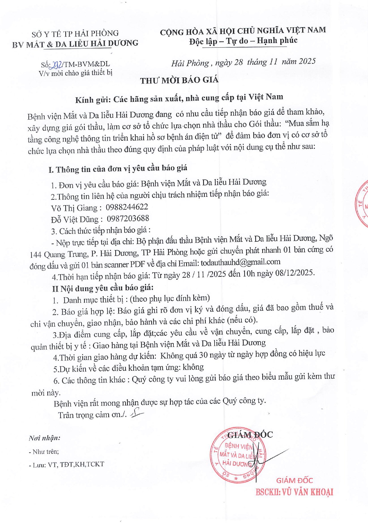 THƯ MỜI THẨM ĐỊNH GIÁ CÁC MẶT HÀNG THIẾT BỊ Y TẾ PHỤC VỤ CÔNG TÁC CHUYÊN MÔN NĂM 2025 benhvienmatvadalieu 09/10/2025 Đọc thêm